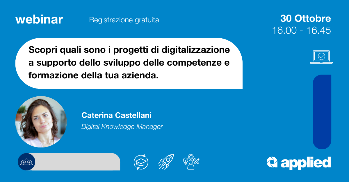 Inoltre, scoprirai le soluzioni digitali offerte da Applied pronte a supportare le aziende nella creazione e gestione delle proprie Digital Academy attraverso la piattaforma Skillgate integrata con i corsi e-learning offerti da Applied nel Catalogo DKT: corsi formativi progettati per sviluppare competenze digitali essenziali, con programmi di up-skilling e re-skilling, guidati da esperti del settore.
